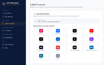 TIP Protocol เป็นส่วนขยาย Chrome ฟรีที่ออกแบบมาสำหรับผู้สร้างเนื้อหาและผู้ชมเพื่อสร้างความถูกต้องของเนื้อหาออนไลน์ มันช่วยให้ผู้ใช้ลงทะเบียนการสร้างของตน ไม่ว่าจะเป็นการสร้างโดยมนุษย์หรือสร้างโดย AI โดยการให้ Content Trust Identifier (CTID) ที่ไม่ซ้ำกันซึ่งเพิ่มความเชื่อมั่นในแพลตฟอร์มต่างๆ ส่วนขยายนี้รวมเข้ากับเว็บไซต์การเผยแพร่และโซเชียลมีเดียที่ได้รับความนิยมอย่างราบรื่น ช่วยให้ผู้สร้างสามารถประกาศแหล่งที่มาของเนื้อหาของตนในขณะที่รักษาความเป็นส่วนตัวและความปลอดภัยผ่านเทคนิคการเข้ารหัสขั้นสูง
